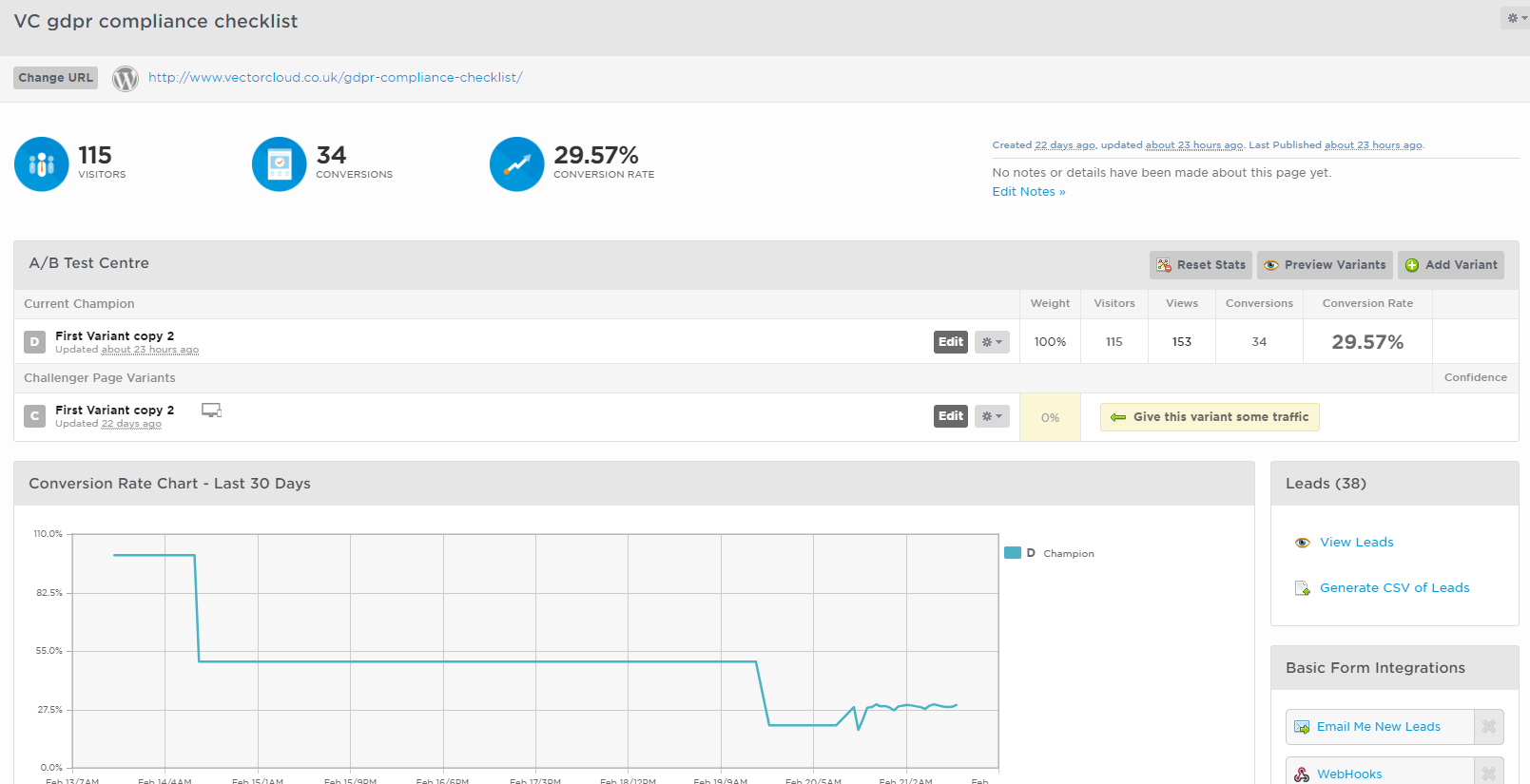 VectorCloud's GDPR Compliance Checklist landing page converted at 29.57%: 34 conversions on 115 visitors. The typical UK B2B benchmark sits at 2-5%. Roughly 10× the category average on a regulated-industries offer with a hard deadline.